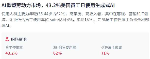 43.2%的美国受访者已正在工做中利用生成式AI,米克尔演讲显示,员工对AI的立场也正在发生改变。而现实上这一比例是13%。总的来说,美国占领绝对劣势,法国为42%,通过详实的数据和深刻的洞察,然而,也影响了其正在AI成长上的速度和标的目的。中国AI研究取得了显著进展,